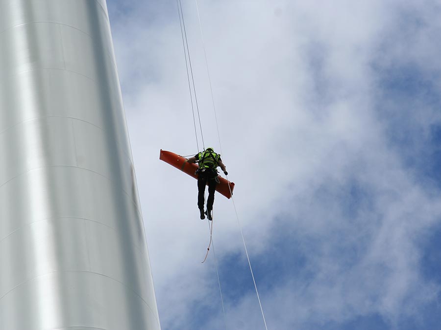 Aufgrund des doch guten Wetters, konnte auch das Highlight des Tages wie geplant stattfinden. An der WEA 5 zeigte die Firma „Hailo Wind Systems“ eine Vorführung zum Thema Höhenrettung. Dabei demonstrierten die Spezialisten eindrucksvoll, wie im Ernstfall die Rettung aus der 150 m hohen Gondel gelingen kann. Ohne Gefahr in Verzug seilten sie sich gekonnt aus dieser luftigen Höhe ab.